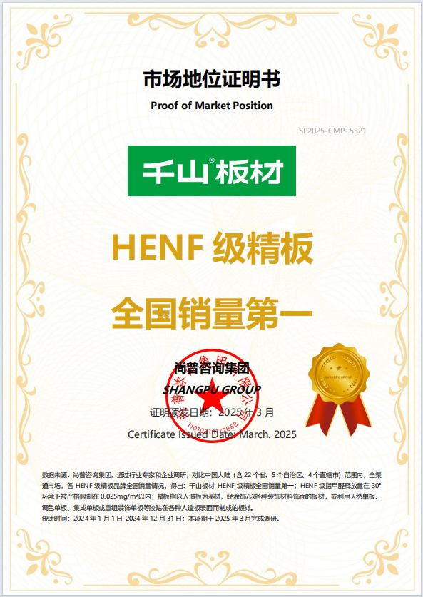 “見山·見未來”千山板材2025全國(guó)經(jīng)銷商峰會(huì),尚普咨詢集團(tuán)曹頡先生親臨峰會(huì)現(xiàn)場(chǎng),為千山板材帶來極具分量的權(quán)威認(rèn)證——千山板材HENF級(jí)精板全國(guó)銷量第一!再次印證了千山板材在環(huán)保家居領(lǐng)域的領(lǐng)先地位。作為中國(guó)最具領(lǐng)導(dǎo)力和權(quán)威性的認(rèn)證公司,尚普咨詢是中國(guó)最早成立的咨詢公司之一,也是首批取得國(guó)家統(tǒng)計(jì)局涉外調(diào)查許可資質(zhì)