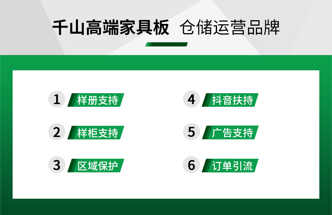 作為高端家具板倉儲運營品牌,千山依托家具板倉儲一體化運營模式,將持續(xù)為全國加盟商及消費者提供更優(yōu)質(zhì)的家具板產(chǎn)品與服務(wù),期待更多的家具廠伙伴加入千山家具板倉儲運營事業(yè),乘風(fēng)并進(jìn),共謀發(fā)展!
