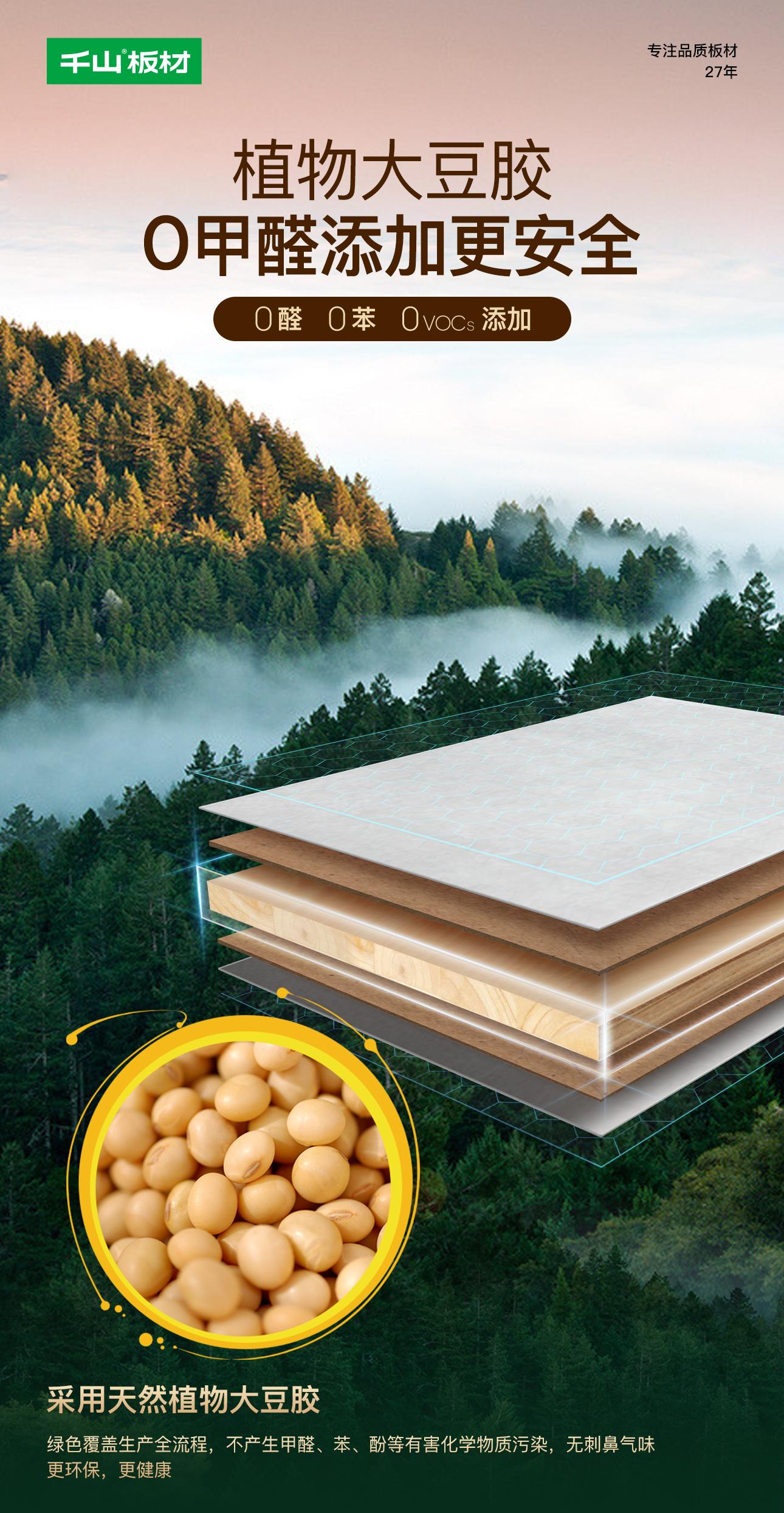 2019年千山憑借敏銳的市場洞察力,成功推出了大豆膠板材這一創新產品,并率先上市,迅速在市場上引起了廣泛關注與熱烈反響,引領行業進入植物豆膠新時代。 自2019年成功上市以來,千山大豆膠板材以無醛大豆膠黏劑技術、優質實木板芯以及無醛添加制造工藝,在無醛人造板市場脫穎而出。憑借卓越的產品品質與環保性能,