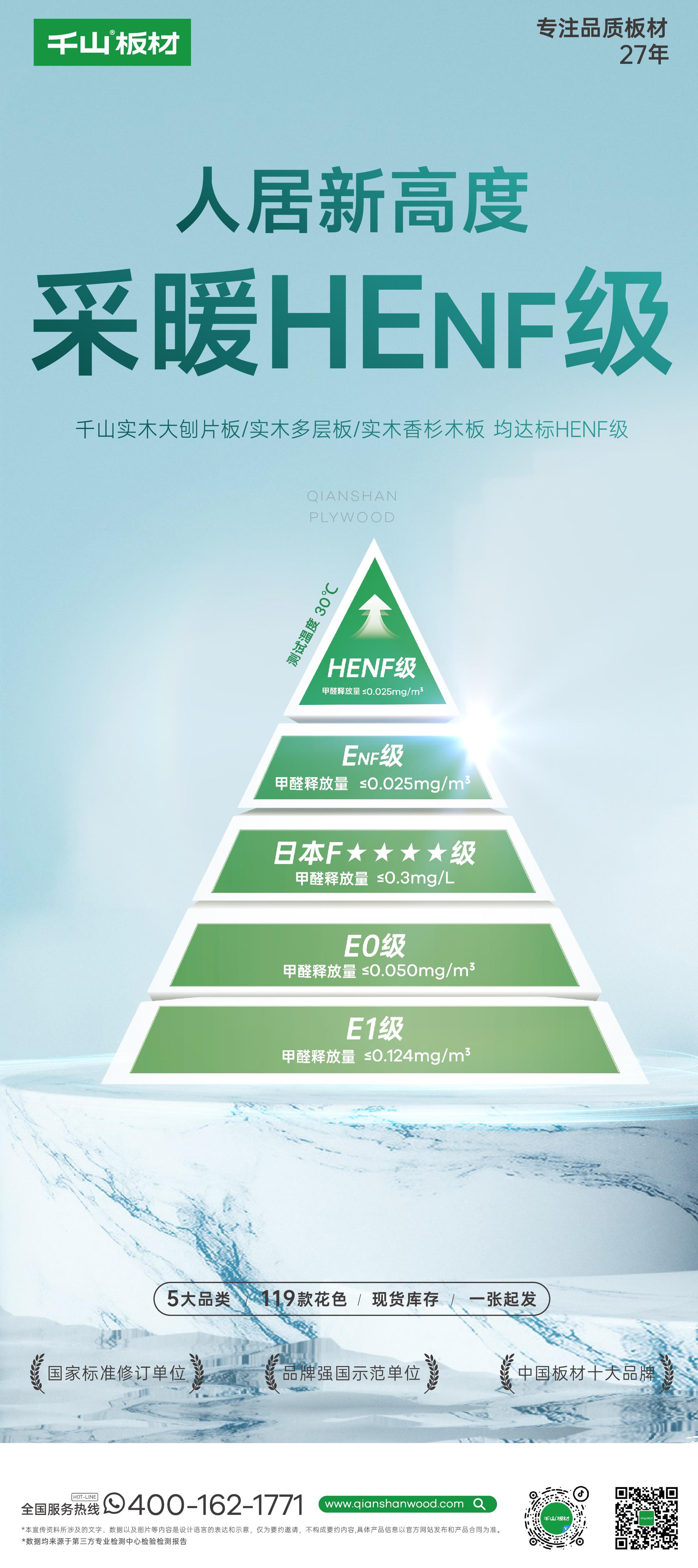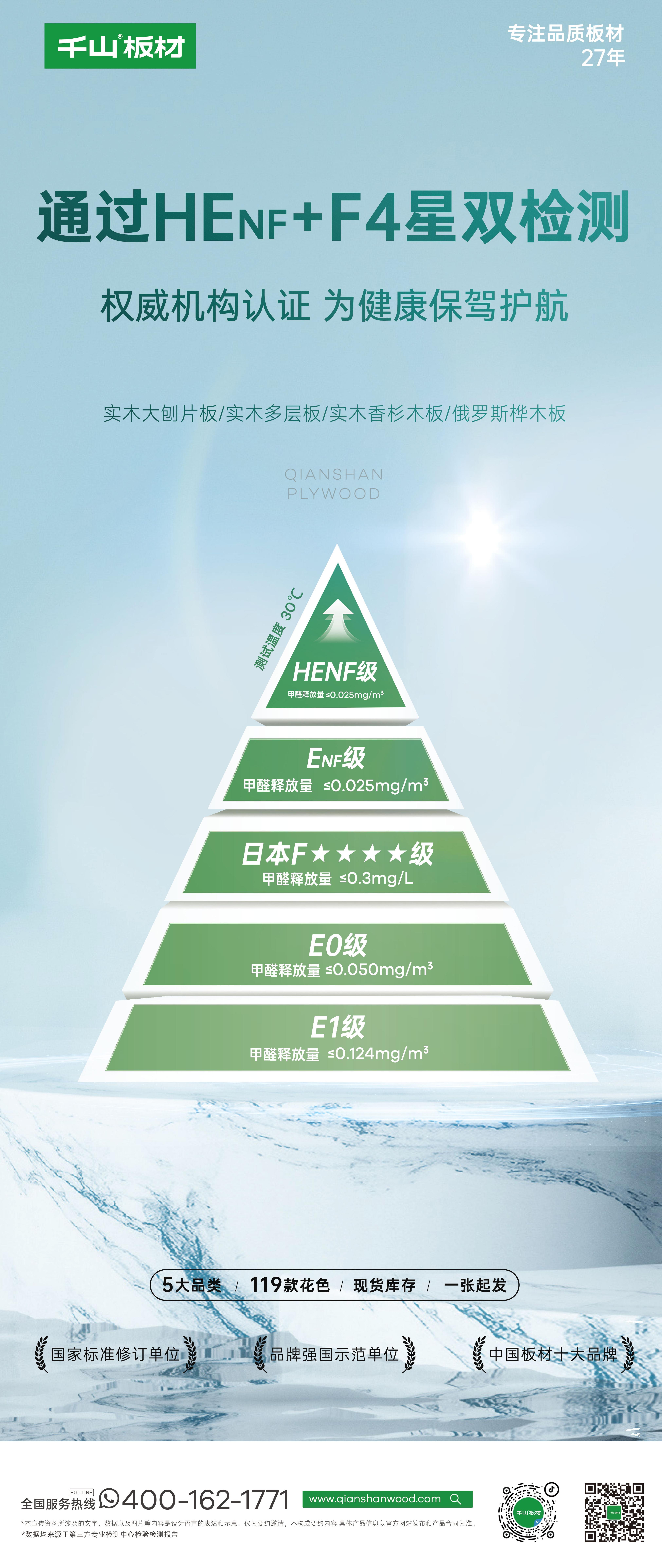 HENF級板材以極低的甲醛釋放量和嚴(yán)格的測試條件,成為目前國內(nèi)外最嚴(yán)格的環(huán)保等級之一,適合用于各種高溫和采暖環(huán)境,為消費者提供了更健康、更安全的家居選擇。千山板材不僅以技術(shù)硬實力搶占環(huán)保制高點,更以用戶需求為中心,重新定義了健康家居的高標(biāo)準(zhǔn)。