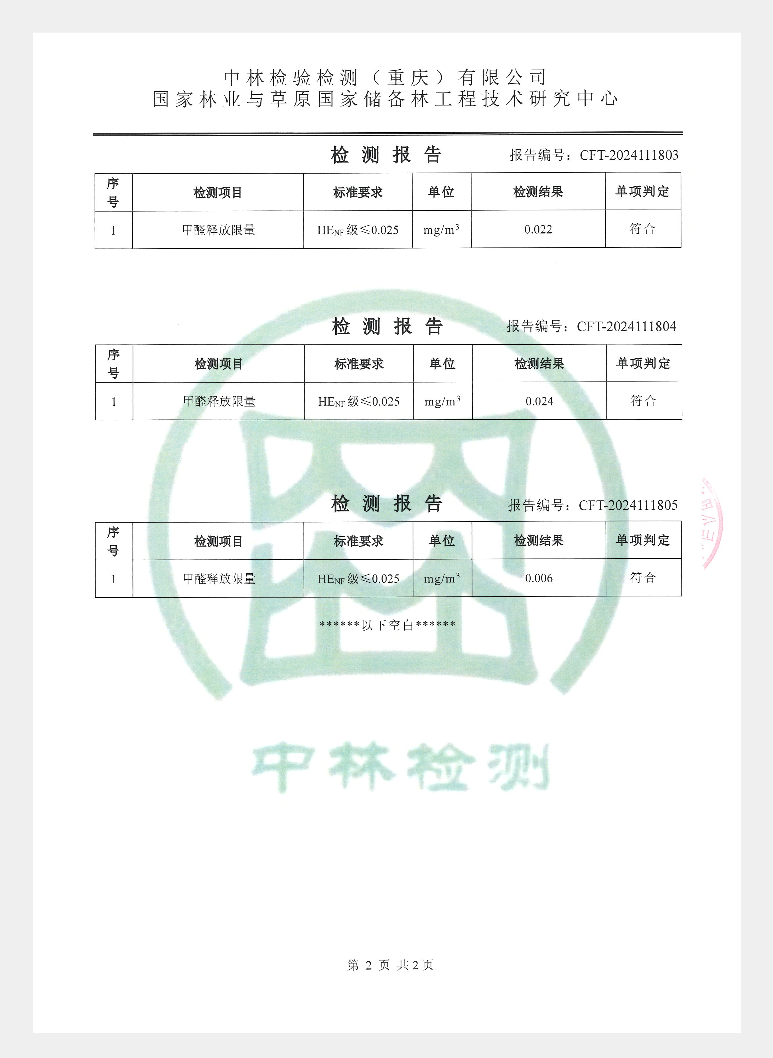 經(jīng)權(quán)威機(jī)構(gòu)檢測,30℃熱環(huán)境下,千山實木大刨片甲醛釋放量為0.006mg/m3,實木多層板甲醛釋放量為0.022mg/m3,實木香杉木甲醛釋放量為0.024mg/m3,均達(dá)HEnf標(biāo)準(zhǔn)要求,同時通過ENF級和F4星雙環(huán)保檢測。